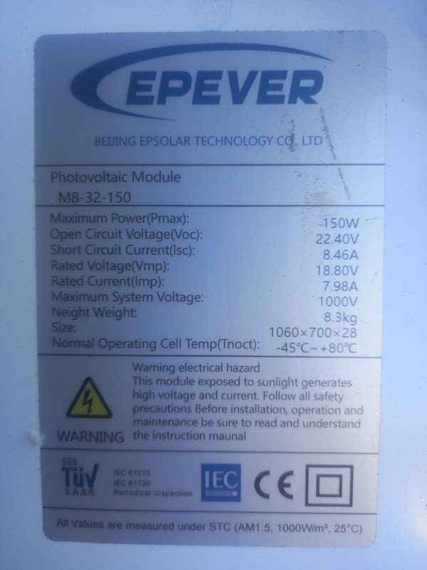پنل خورشیدی ۱۵۰ وات EPEVER نوع پنل: مونوکریستال راندمان بالا برند EPEVER حداکثر توان خروجی در شرایط استاندارد (STC): ۱۵۰ وات ابعاد: 28 × 700× 1060میلیمتر وزن: 8.3 کیلوگرم نوع سلول گرید A ولتاژ در حداکثر توان (Vmp):18/8 ولت جریان در حداکثر توان (Imp):7/98آمپر طول عمر: ۲۰ سال دارای استاندارد کیفی TUV آلمان، CE اروپا عملکرد فوق العاده در محیط های کم نور تابش ماژول دارای عملکرد خود تمیز شوندگی در محیط آب مقاومت بالا در برابر نمک و آمونیاک